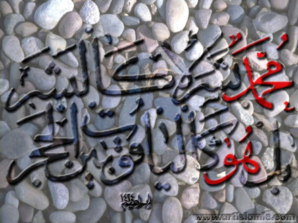 3D Islamic calligraphy work with Arabic poem lines about Prophet Muhammad (saaw) with stones background