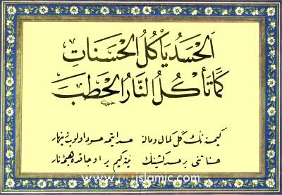 Okunusu: "El hasedu ye'kulu'l hasenâti kemâ te'kulun nâru'l hatab."