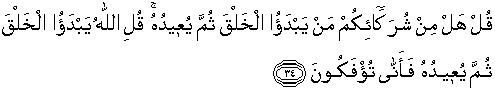 Say: "Of your 'partners', can any ORIGINATE CREATION AND REPEAT IT?" Say: "IT IS ALLAH WHO ORIGINATES CREATION AND REPEATS IT: then how are ye deluded away (from the truth)?"