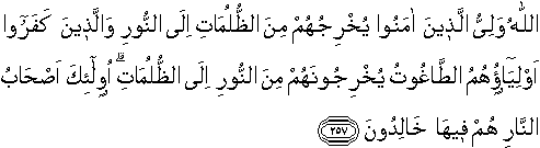 ALLAH IS THE PROTECTOR OF THOSE WHO HAVE FAITH: from the depths of darkness He will lead them forth into light. Of those who reject faith the patrons are the Evil Ones: from light they will lead them forth into the depths of darkness. They will be Companions of the Fire, to dwell therein (forever).
