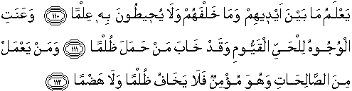 He knows what (appears to His creatures as) before or after or behind them: but they shall not compass it with their knowledge. (All) faces shall be humbled before (Him), the Living THE SELF-SUBSISTING, Eternal: hopeless indeed will be the man that carries iniquity (on his back). But he who works deeds of righteousness, and has Faith, will have no fear of harm nor of any curtailment (of what is his due).