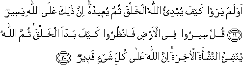 See they not how ALLAH ORIGINATES CREATION, then repeats it: truly that is easy for Allah. Say: "Travel through the earth and see how ALLAH DID ORIGINATE CREATION; so will Allah produce a later creation: for Allah has power over all things.