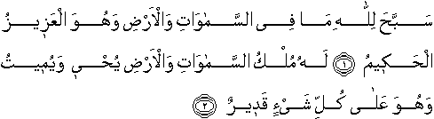 Whatever is in the heavens and on earth, Let it declare the Praises and Glory of Allah: for He is the Exalted in Might, the Wise. To Him belongs the dominion of the heavens and the earth: it is HE WHO GIVES LIFE AND DEATH; and He has Power over all things.